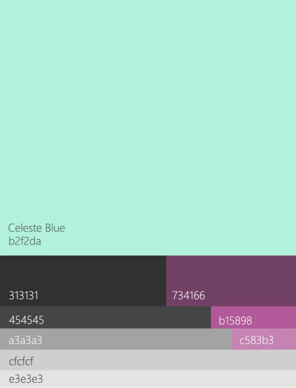 Celeste Blue is a delicate, pastel blue that mirrors the soft hues of a clear morning sky, often seen in the subtle shades of spring flowers and the serene expanse of calm waters. Its unique blend of lightness and tranquility sets it apart from other blues, making it a visual breath of fresh air. Regal Purple is a dark, muted, pretty peony purple with a grape juice undertone. And of curse the palette need some steady natural color which hold everything together, and that would be Carbon, Stone, Smoke Gray.