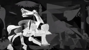 لوحة واحدة في مواجهة الحرب. غيرنيكا هي لوحة بيكاسو التي تجسد معاناة العنف والحرب والفوضى. حيث الرمزية والسريالية والكولاج التكعيبي أقوى أثرا من الرومانسية والواقعية. تعد غيرنيكا من أشهر لوحات الفنان الإسباني بابلو بيكاسو.. رسمها عام 1937 بناء على طلب الحكومة الإسبانية إثر تعرض بلدة غيرنيكا الإسبانية لقصف جوي عنيف من قوات الاتحاد النازي والفاشي لألمانيا وإيطاليا. وهي لوحة دمج فيها الفنان الأسلوب السريالي والتكعيبي والعناصر المتداخلة بطريقة الكولاج مع الإيحاءات الرمزية الواضحة ولم يستخدم فيها الواقعية الصريحة. ويعتبرها العديد من نقاد الفن اللوحة الأكثر تأثيراً وقوة ضد الحرب في التاريخ.
