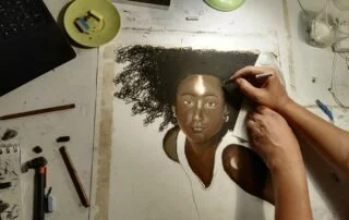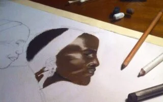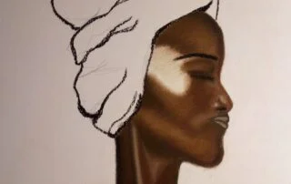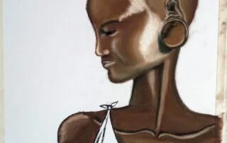 I have always liked the art of portrait because it highlights the spirit and the depth of character drawn by just looking at facial expressions, especially the eyes. I choose to use pastel colors in my African line. Although these colors are difficult to use because it is hard to remove the color and change it if it is placed on paper.. However, I preferred to use it because I mix colors using my own fingers directly, and this makes me more connected with the artwork and more able to convey my feeling in my paintings. I prefer to paint portraits of dark-skinned people in particular, because they are very shiny, which clearly shows the shadow and light on the skin, so it looks as if it was carved with perfection.. I love highlighting these details specifically in my paintings. Most of my paintings in African calligraphy depend on drawing portraits, highlighting its details, and simplifying any other element present in the painting, such as ornaments, fabrics, or any other dispersed elements. I used black charcoal pen here to draw the outlines in a simplified manner for these secondary elements.